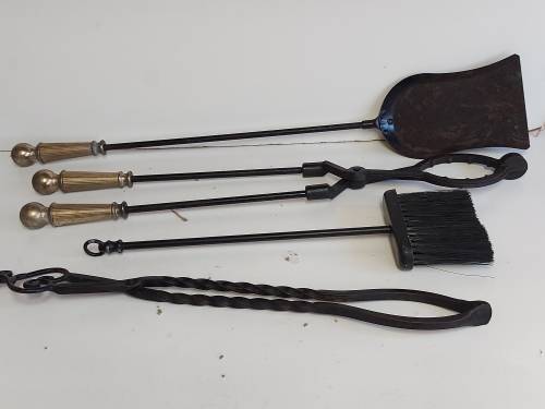 VINTAGE SET OF CAST IRON FIRE IRONS, TWO WITH BRASS HANDLES. THE SET COMPRISES FOUR ITEMS, A SCOOP OR SHOVEL, TWO TONGS SETS AND A BRUSH. THEY ARE IN WELL-PRESERVED CONDITION AND MEASURES 74 CM, 67 CM, 57 CM, AND 48 CM LONG RESPECTIVELY