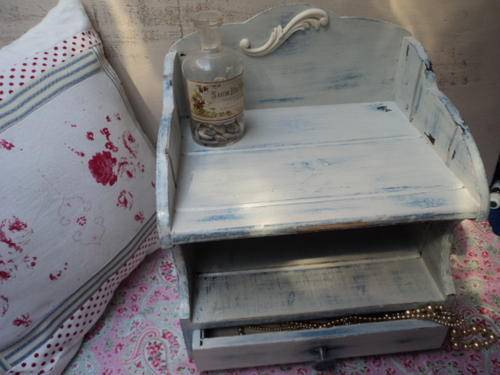 This is a wonderful, desk organizer, apothecary cabinet, wall shelf in the shaker style that you'll be able to put to tons of good use. I've given it some french blue color, then a creamy white and gently distressed it for the blue and wood tones to peep through. I added the FAUX WOOD WHIMSY to the back!