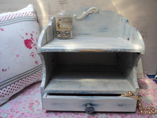 It can either mount on a wall (I will put 2 saw tooth hangers to the back) or sit on a flat surface. It has an open display shelf, perfect for desk accessories, apothecary jars or other treasures, and has 1 drawer on the bottom with a brass knob. I think it would also be perfect for holding recipe books or spices in the kitchen.