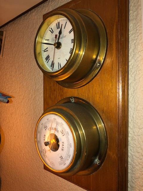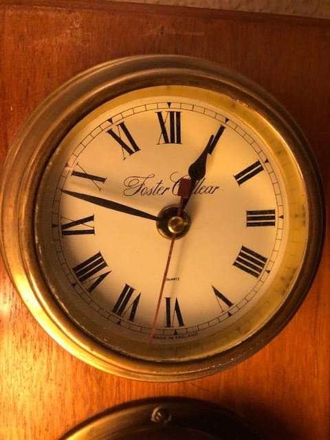 VINTAGE SOLID BRASS TOP QUALITY INSTRUMENTS -MADE IN ENGLAND- BAROMETER AND QUARTZ CLOCK ON WOODEN BASE IN EXCELLENT CONDITION AND PERFECT WORKING ORDER.LOVELY SIZE 150 mm DIAMETER AND BASE MEASURES 200 mm x 370 mm . THE BEST PRESENT FOR A MAN WHO GOT A BOAT .
