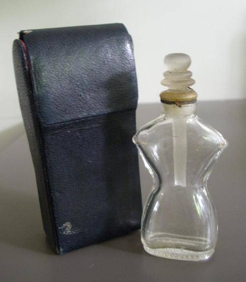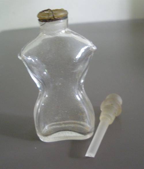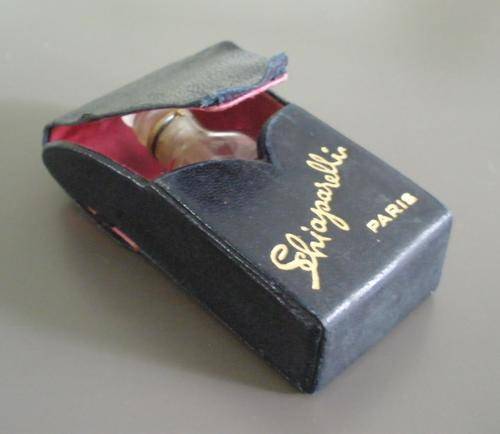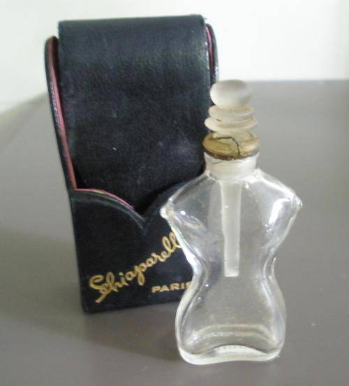 Beautiful vintage Shocking Schiaparelli glass perfume bottle in the form of a ladies torso. It is marked on the base of the bottle 'Schiaparelli, France'. It has its original glass stopper with glass dauber and it comes in its original black leather case which is embossed with the Schiaparelli, Paris. The case is lined in pink silk and is in good condition, some scratches to the exterior leather and pink lining has areas of dirt marks. The bottle is in good condition but the tip of glass dauber has broken off. The bottle measures 7cm tall.