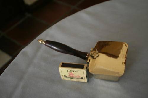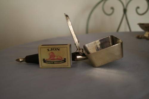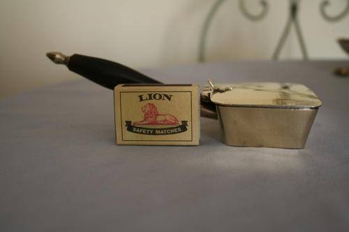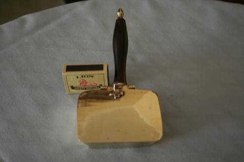 Silent butler "A small receptacle with a handle and hinged cover, used for collecting ashes (from ash trays) and crumbs from table cloths" with hinged lid and handle.