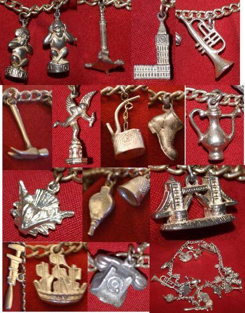 Lovely assortment of vintage charms. Opium bottle with little chain, Big Ben, Hammer, thimble, trumpet, shoe, ship, urn, teapot, to name a few. 19 in total. The one charm - old fashioned telephone looks like it is made from Pewter. The chain is approximately 30cm in length. The clasp is broken.
