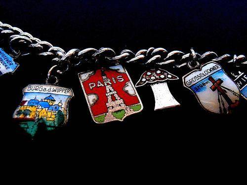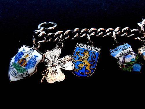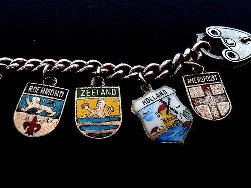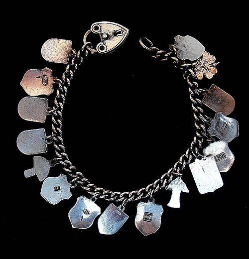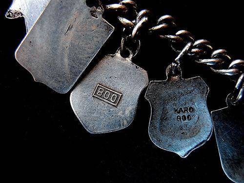 Vintage silver enamel travel shield bracelet. Groot Constantia, Bad Nassau, Münstener Brücke, Burg a.d. Wupper, Paris, Grossglockner, Wien, Rotterdam, Klagenfurt, Roermond, Zeeland, Holland, Amersfoort. Small padlock is the closing/opening mechanism!