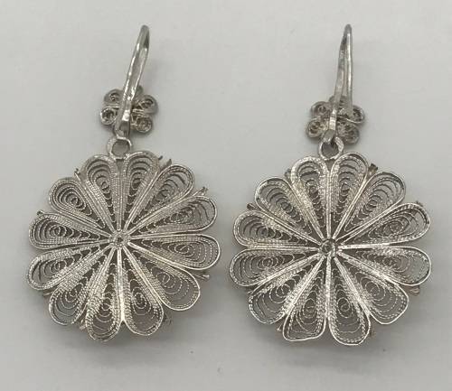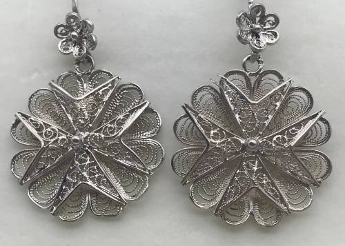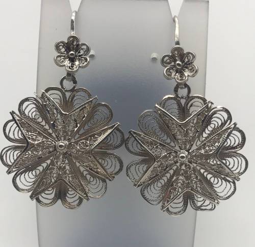 These stunning silver filigree hanging earrings are in the shape of a flower with a Maltese Cross set in the centre. They are in lovely condition. They have the silver hallmarks for Malta on the shepherd hooks.