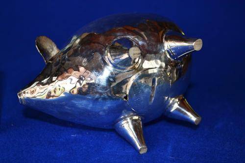 LENGTH IS 18CM AND THE HEIGHT IS 14M. THIS SILVER METAL PIGGY IS QUITE CUTE AND VERY SOLID.