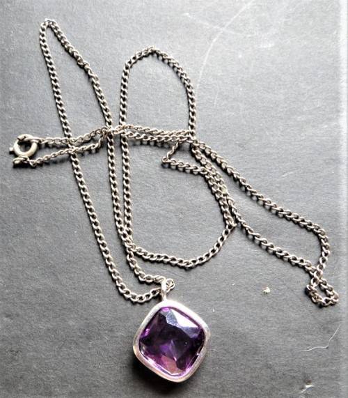Vintage Silver Metal & Purple Stone Necklace & Pendant - no markings