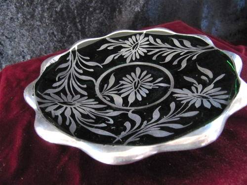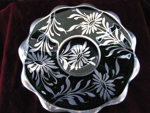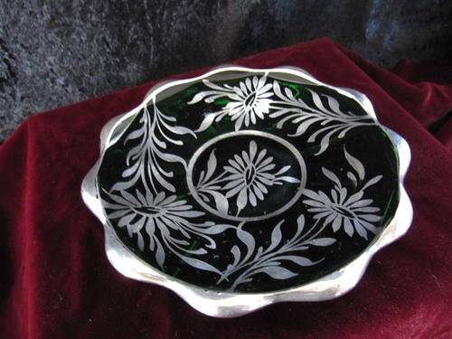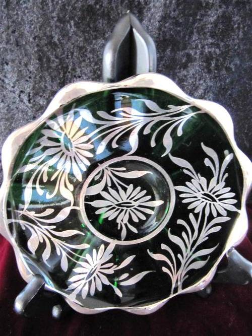 Lovely silver overlay dish. Hand-painted floral design on a green vintage glass dish.