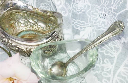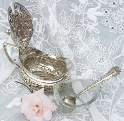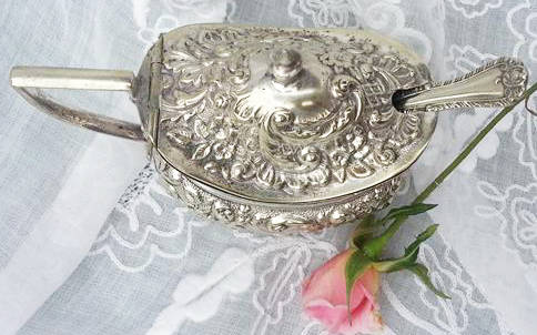 PRETTY SILVER PLATED MUSTARD POT WITH SPOON, THE CLEAR GLASS LINER HAS NIBBLES AROUND THE RIM, THE HINGE IS WORKING WELL AND THERE IS SOME WEAR TO THE PLATING, LENGTH 8.5cm, HEIGHT 6.3cm, WIDTH 4.5cm.