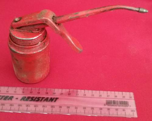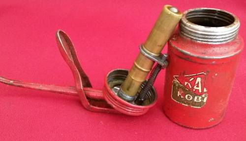 Small red "Kabi Hobby" oil can with nozzle, made in Denmark. Fully functional, just needs a good clean (left it as found,` some collectors want it in original condition). Good condition all round, but with a bit of paint loss.