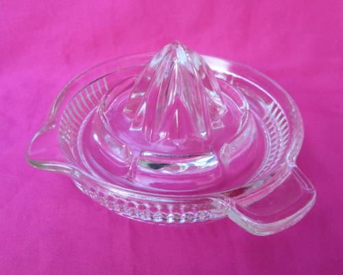 A lovely vintage solid and heavy clear glass citrus juicer, in good condition, 14.5 cm in diameter.