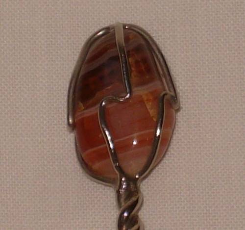 A silver plated coffee spoon, finial decorated with a semi-precious gemstone.