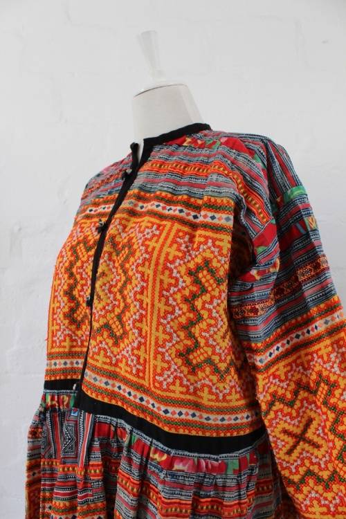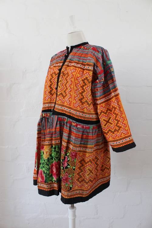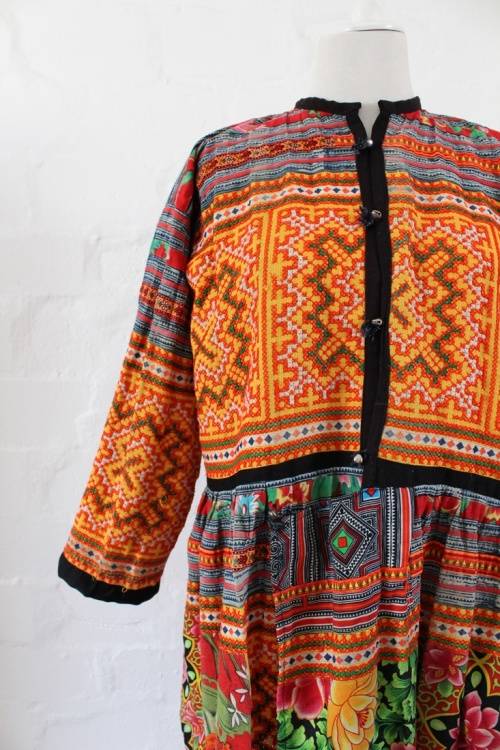 Beautiful unique authentic vintage South American tapestry dress. Comprised of a patchwork of different printed fabrics and some hand crafted needlepoint panels. Has small bells as buttons down front. One of a kind.