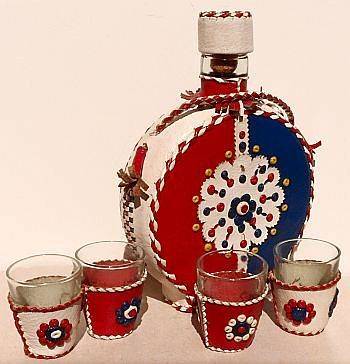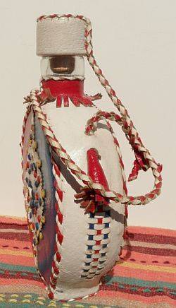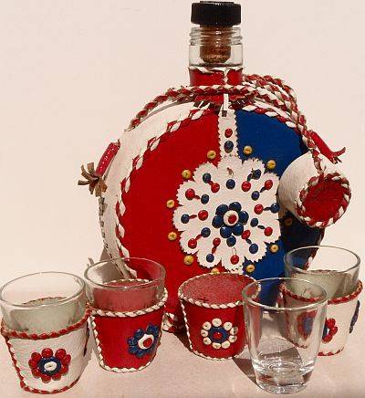 LEATHER COVERED LIQUOR BOTTLE AND 4 SHOT GLASSES