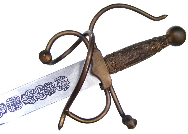 The markings read "Colada Del Cid" (roughly translated as forged pure from different metals, belonging to Cid, and displaying the coat of arms of Toledo Armas (Toledo weapons factory).