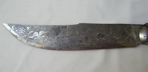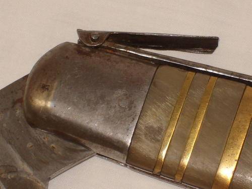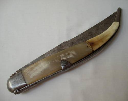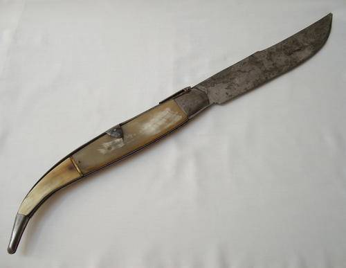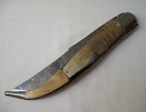 A steel and horn nine-click lock-back fighting knife, blade etched with a