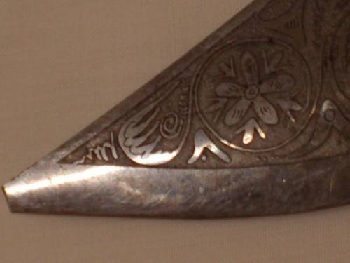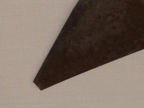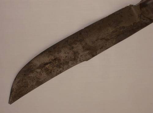 Blade tip broken and knife edge with several small chips, overall discoloration