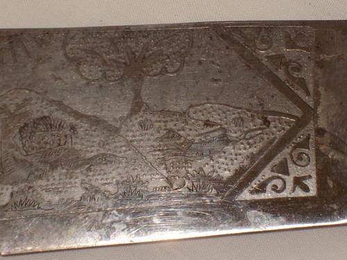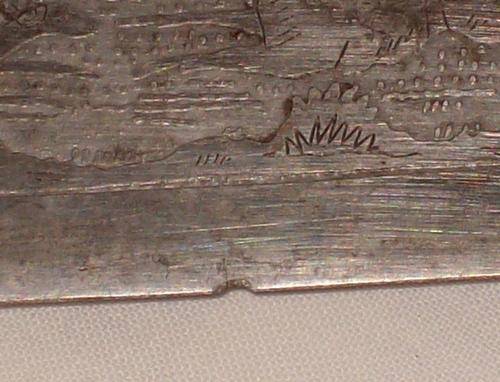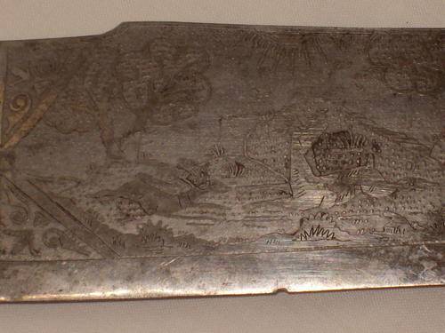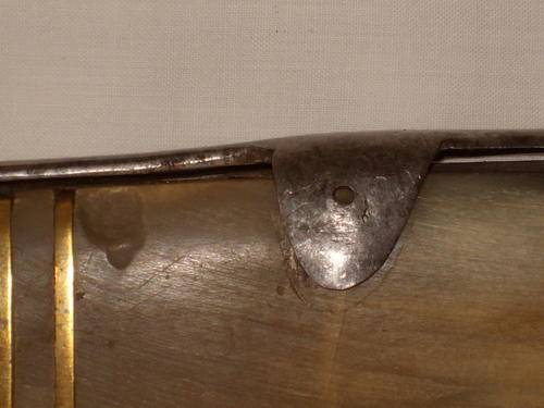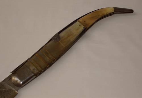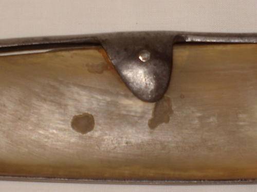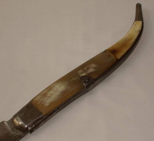 and tarnishing. Horn handle with several chipped areas and one dislodged rivet.
