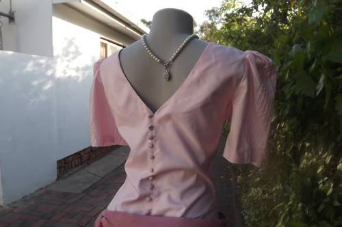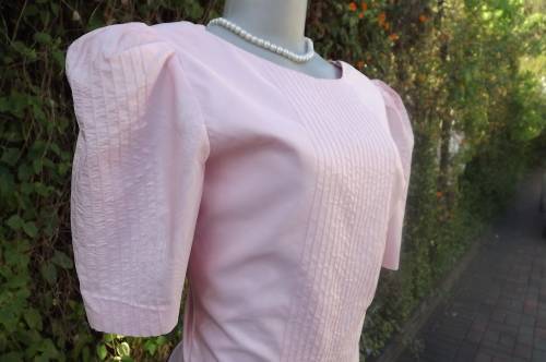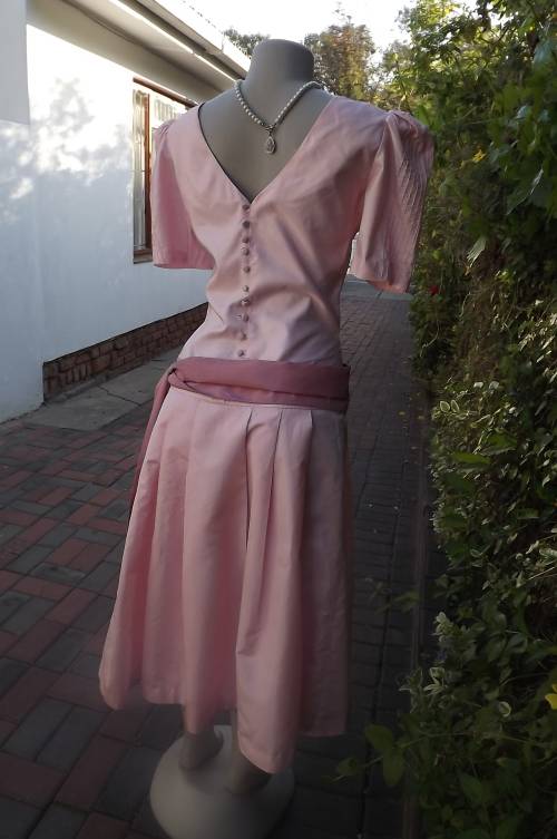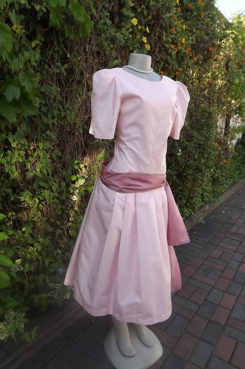 Vintage special occassion dress in light pink tafetta fabric.Size 32/8.Dropped waist.Tucking on top front and on short sleeves.Pleated skirt.Fully lined.Low V button down back.Darker pink sash which you can use or wear without.Good condition