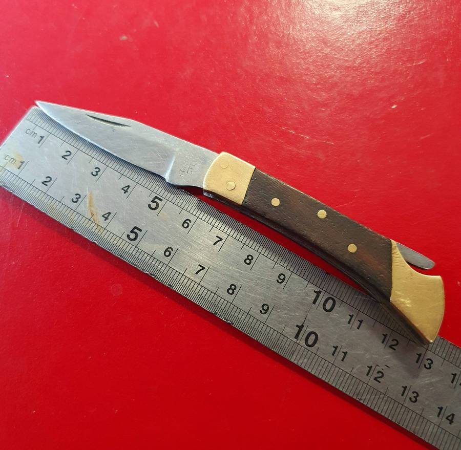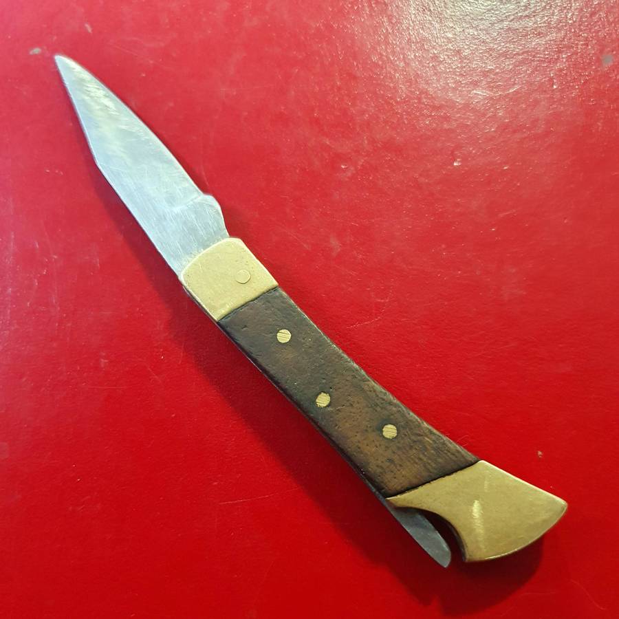 ON AUCTION: VINTAGE STAINLESS AND BRASS WITH WOOD FOLDING KNIFE.