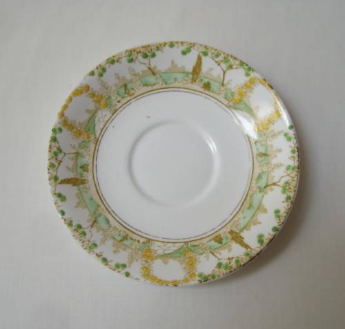 An Art Deco era white glazed porcelain saucer, decorated with a green and yellow