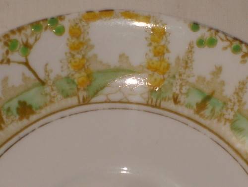 border of trees, floral arches, pathways and lawns, remnants of gilt edged rim.