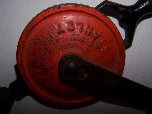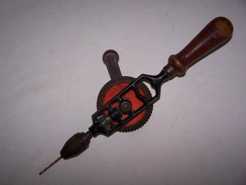This very well made vintage Stanley hand-drill was made in England and is in perfect working order. It has a cast iron body and wooden handles.