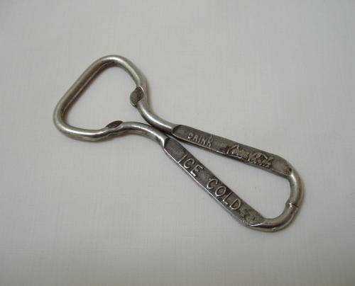 A punched and welded steel bottle opener, advertising Coca-Cola.