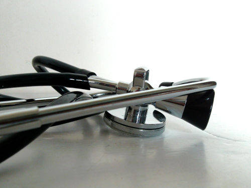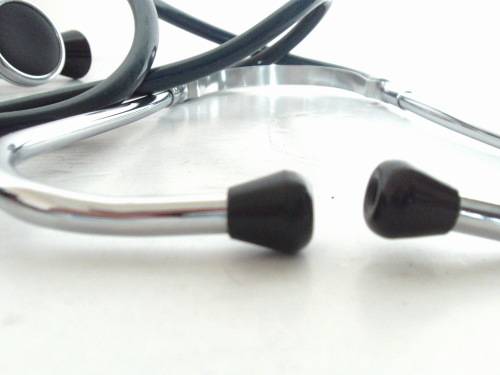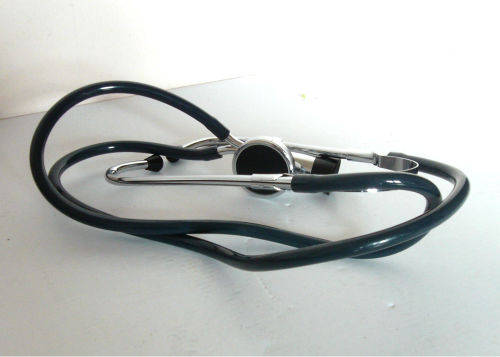 This is a vintage stethoscope, a nice present for a medical professional, a doctor, a collector of soviet medical equipment, metal and rubber and wood. Acoustic stethoscopes are familiar to most people, and operate on the transmission of sound from the chest piece, via air-filled hollow tubes, to the listener's ears. The chestpiece usually consists of two sides that can be placed against the patient for sensing sound; a diaphragm (plastic disc) or bell (hollow cup). If the diaphragm is placed on the patient, body sounds vibrate the diaphragm, creating acoustic pressure waves which travel up the tubing to the listener's ears. If the bell is placed on the patient, the vibrations of the skin directly produce acoustic pressure waves traveling up to the listener's ears. The bell transmits low frequency sounds, while the diaphragm transmits higher frequency sounds.