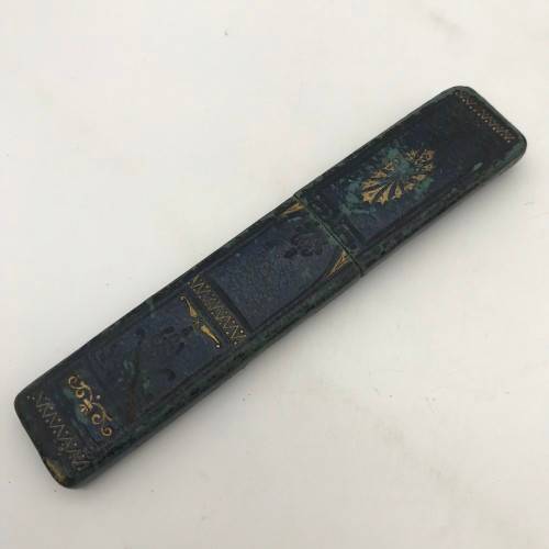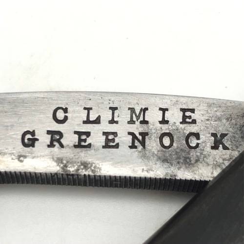 This early, traditional, boxed, possibly Scottish, folding cut-throat or straight razor with a black handle appears to be in excellent condition with a very sharp 'Barbers notch' point type blade. The blade is stamped 'REAL HOLLOW GROUND' with the arm of the blade being stamped 'CLIMIE, GREENOCK'. The razor comes with its original, worn, blue and gilt box. The box with razor measures 17cm x 3cm.