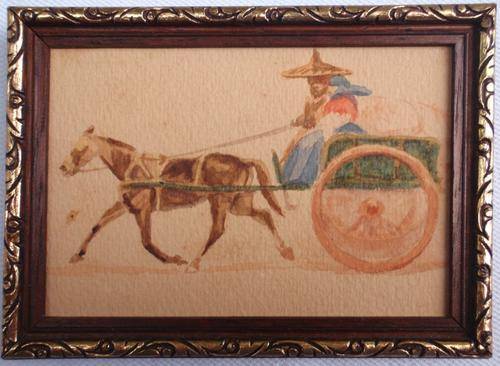 VINTAGE: STRANGE LITTLE WATERCOLOUR. FRAMED BEHIND GLASS. SIZE: 14CM X 10CM.