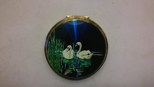 Good condition - hinges, lock and mirror intact. Beautiful Swan Enamel Motif. Stamped Stratton Made in England on the back. Inside stamped with classic patent number 764125. No powder sifter or powder puff.