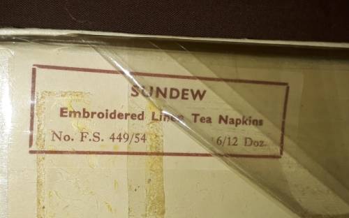 These beautifully embroidered napkins have never been used. The lid of the box has a few dirty marks and at the back of the box there are tape residue. The cellophane wrapping paper are a bit brittle and yellowed from age.