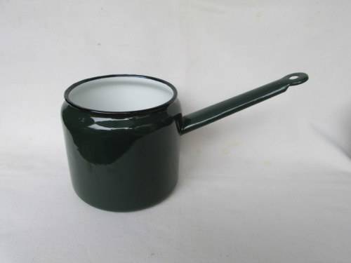 A lovely vintage Swedish green and white enamel boiler with black rim, very minor wear, 13 cm high, base diameter 13.5 cm, top diameter 12.5 cm, length with handle 28 cm.