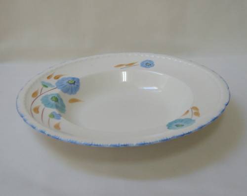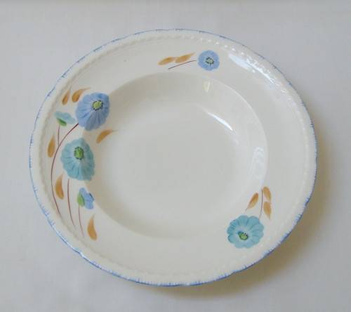 An ivory glazed china soup plate, decorated with hand-painted blue and turquoise