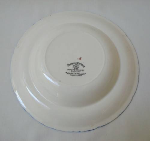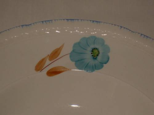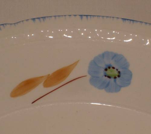 flowers with green and brown centres, russet leaves and stems, blue edged rim.