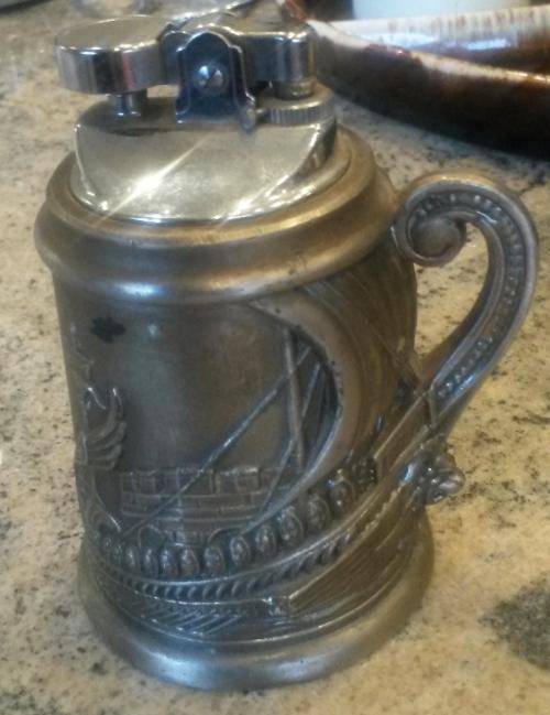 vintage table lighter with viking ship has small wear on the one side but otherwise ok - dont know if it works or how ot works not my strongpoint but decorative - price exc shipping but we can quote if needed - thanks for looking and ask if questions