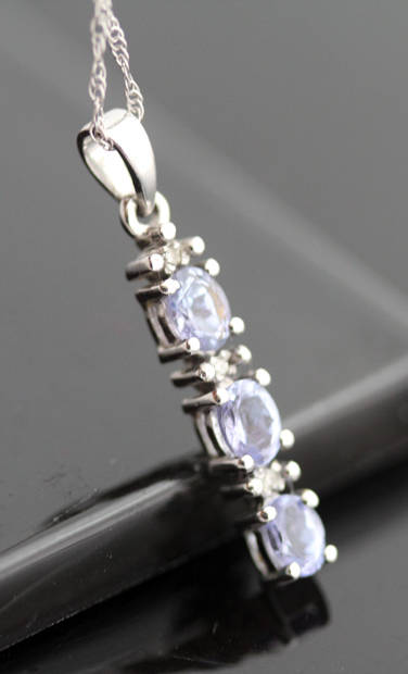 Not sure of the origins of this piece but I bought it from a favourite vintage jeweller in London. A very simple, geometric design for the pendant - 3 oval cut pale lilac tanzanites are claw set, with the claws themselves forming the sides of the pendant structure; an interesting square cube-like setting giving it a solid modern feel. Each gemstone is 3mm x 3mm, set in 10k white gold. Separating the tanzanites are 3 small round cut diamonds, for a touch of glamour and sparkle. The white gold chain is very delicate (fine) and is also hallmarked 10k. Simple, classy and classic.