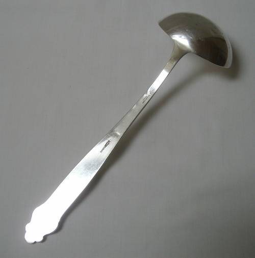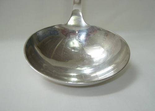 An electroplated nickel silver soup ladle, handle finial decorated in the