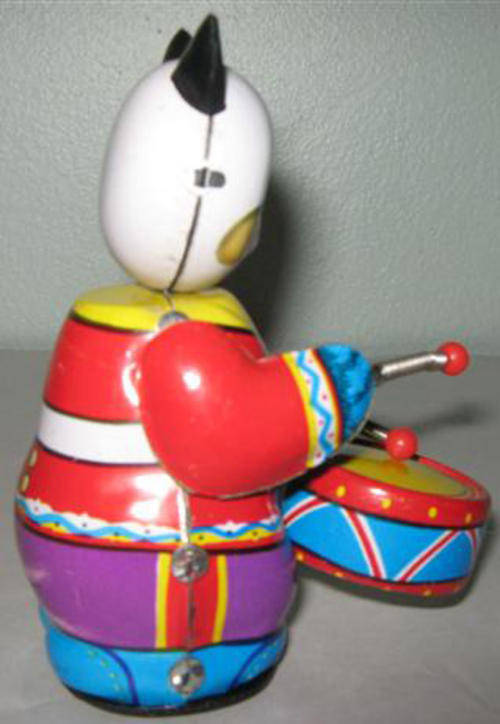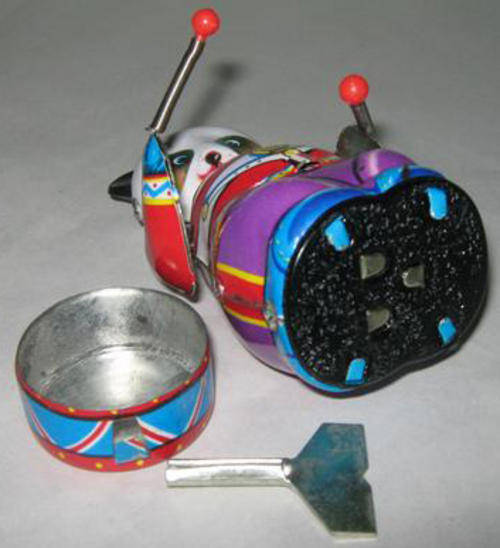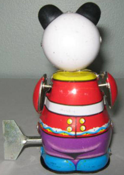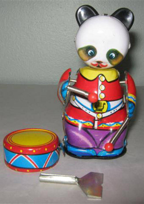 VINTAGE TIN PLATE PANDA BEAR PLAYING THE DRUMS, WIND UP WITH KEY.