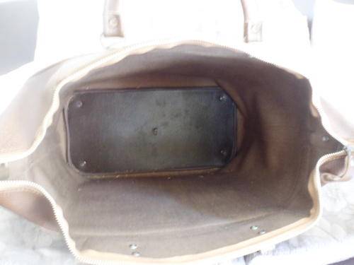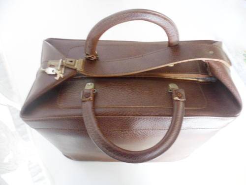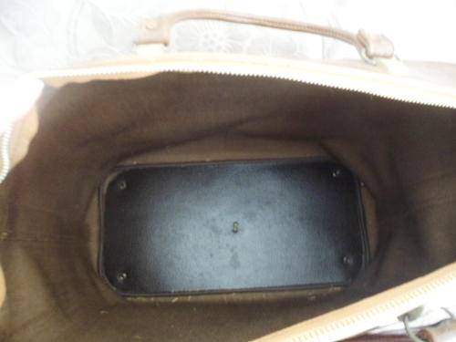 A Vintage Leather-Like Travelling Bag. With original lock & keys on the over-lapping flap. The zip is a bit sticky, but opens & closes, I am reluctant to replace anything as it is in its original condition.