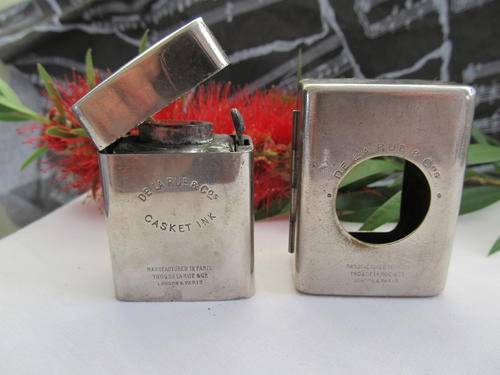 This inkwell consists of three parts, it has the outer casing, the main inner and a little glass bottle. The main inner has a sprung lid. The inscription on the outer casing is ' De La Rue & Cos - Casket Ink - Manufactured in Paris, Thos de la Rue & Co - London and Paris'. It measures 4 x 5.5 cm. Some age damage.