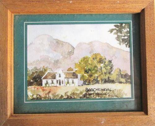 A lovely vintage trio of solid wooden framed Cape Dutch Homesteads, signed prints, size 9 cm x 11 cm.