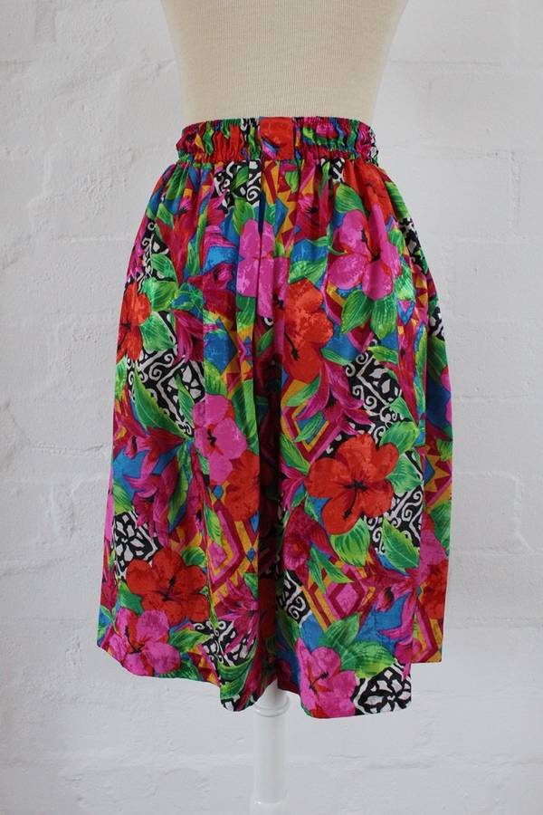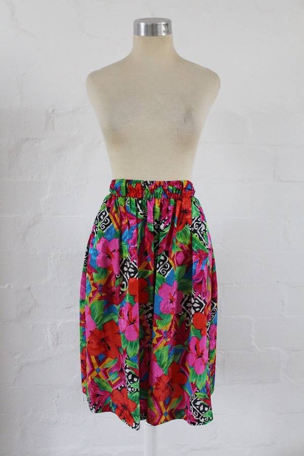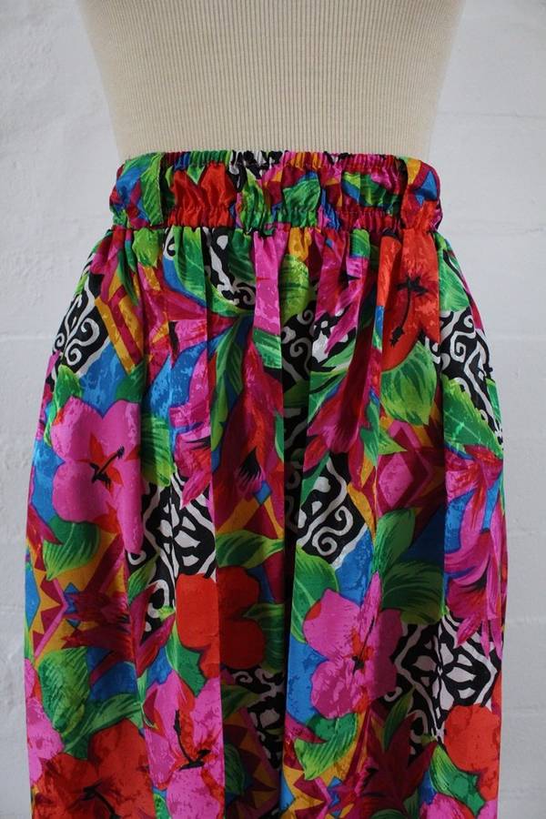 Beautiful authentic vintage bold tropical floral print wide leg culottes/ pants that look like a skirt. Concealed side pockets. Elasticated at waist.