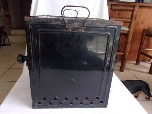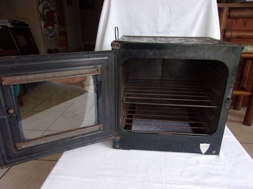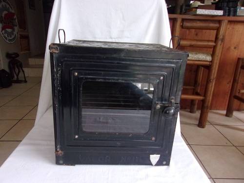 Vintage Valor No. 111 camping oven/ stove. I would date this old English produced stove to the late 1940s. It would seem as though it would either have been placed over the coals of a fire or would have had optional extras - a 4 legged stand under which a Valor Junior 65 could be placed to create heat. It has a metal plate on the bottom of the bottom grid, which would prevent the food from direct heat. On offer is the oven only, which measures 33cm (l) x 29cm (w) x 34 (h). The oven is in fair condition for its age, with hinges and door latch working perfectly. There is some surface rust, and I am not sure is the glass on the door is original. Great buy for the collector.