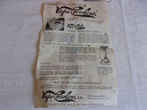 Vintage Vapo-Cresolene vaporiser with original box and instructions. I would date this old vaporiser to the 1920/30s. Purported to treat Asthma, whooping cough, head colds etc, the vaporizer consists if a stand and a burner with a flue. It is in good condition for its age - still has the original box and instructions which are a bit shabby. Great buy.