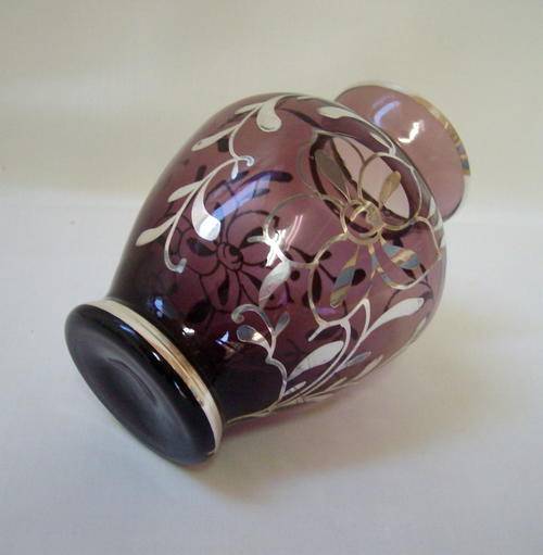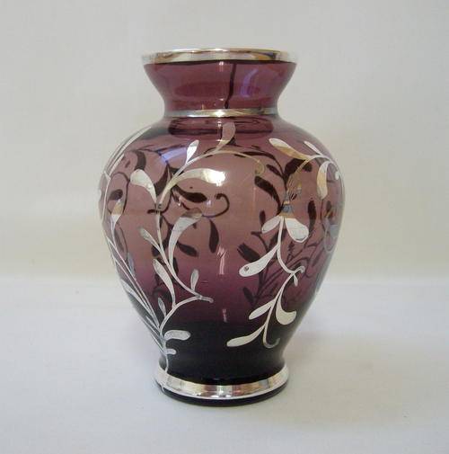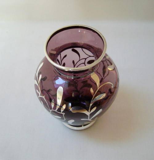 A purple amethyst glass vase, decorated with silver overlay floral and foliate motifs.