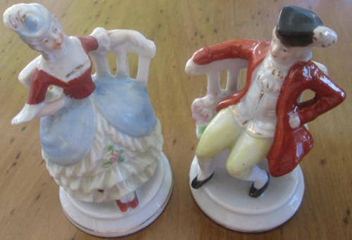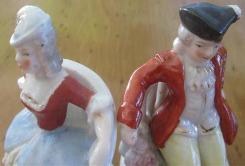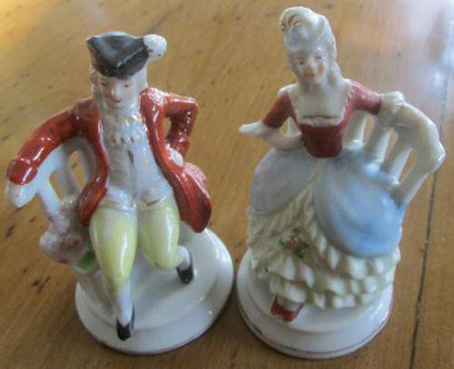 PORCELAIN PAIR OF MATCHING FIGURINES, POSSIBLY A SALT AND PEPPER CONDIMENT SET, CONDITION GOOD, HEIGHT 9cm.