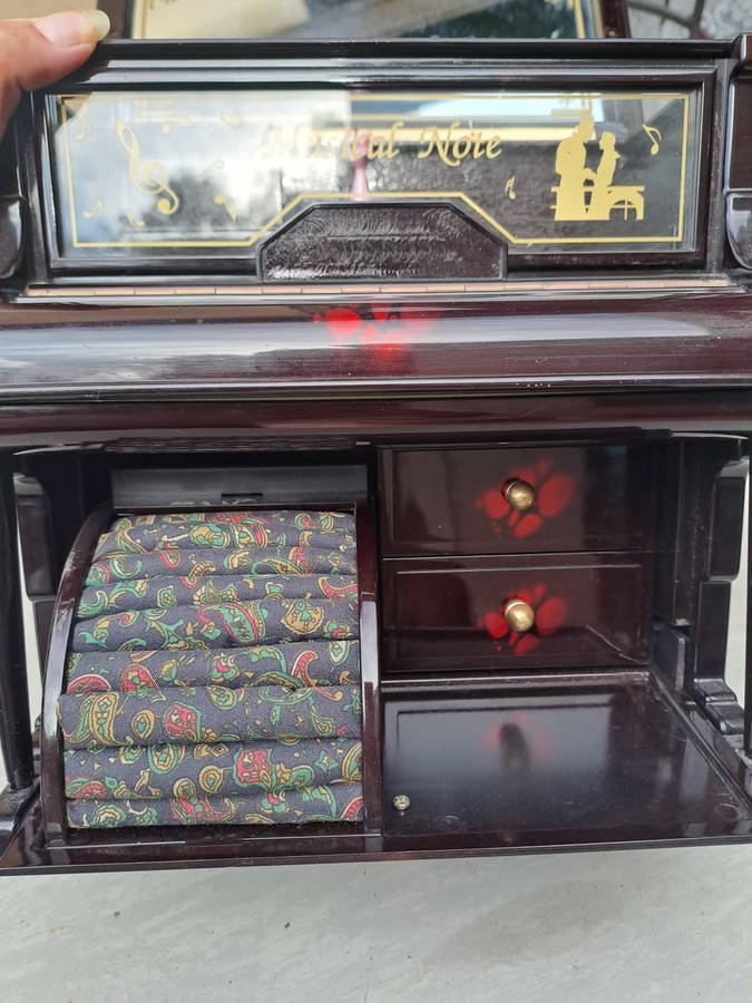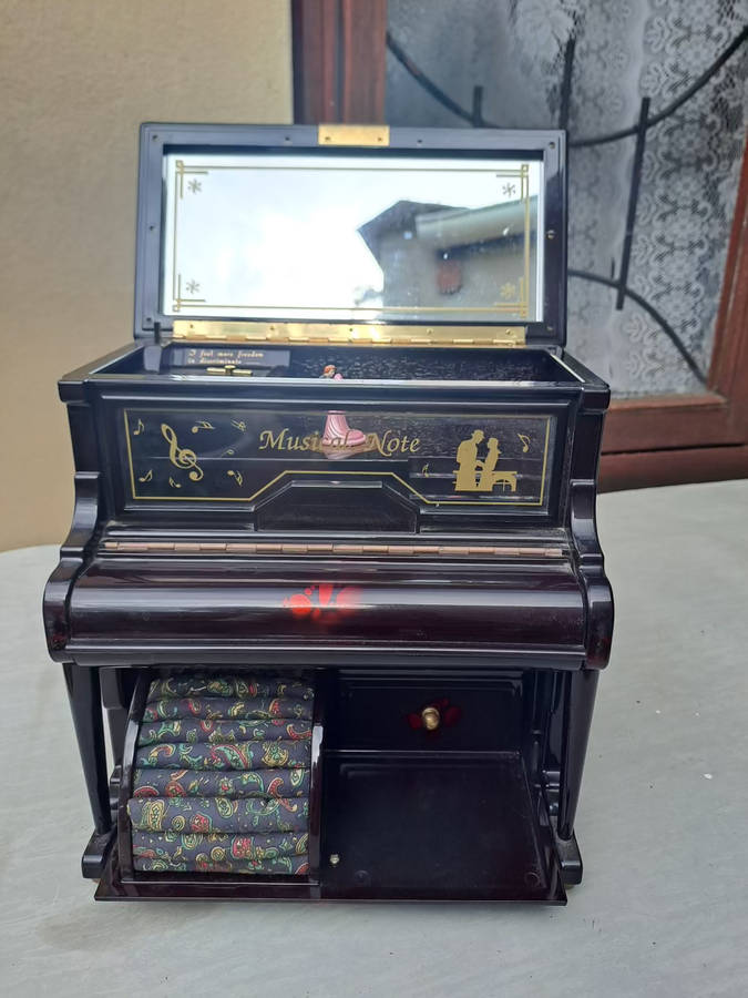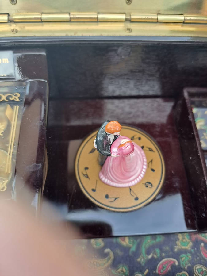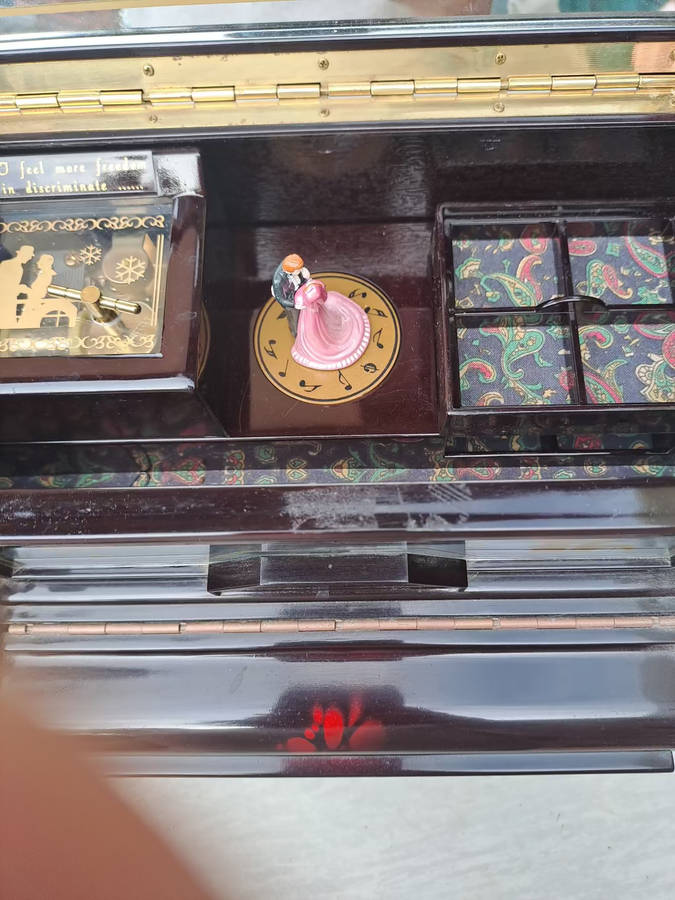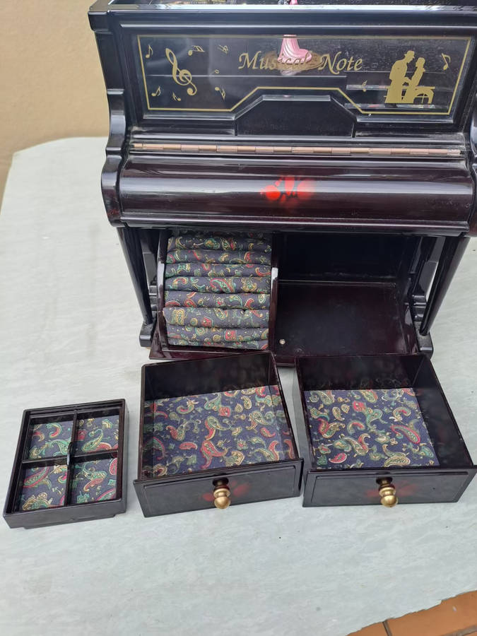 Vintage Vstride piano jewelry music box with dancing pair. very pretty and plays a nice tune. lots of space for precious jewelry and keepsakes. 100% working