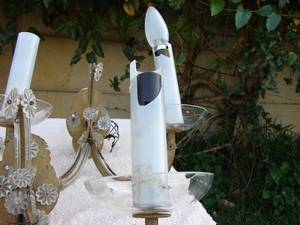 Five pewter, metal and glass scones. Still has vintage wiring on it. Damage on some pieces but can make three maybe four good ones.
